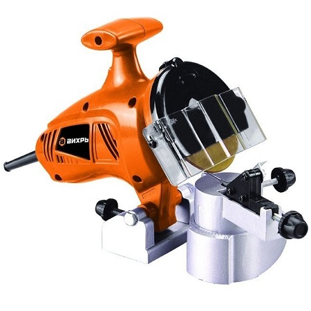 Посадочный диаметр 22,3 мм. Диаметр диска 114 мм. Частота вращения 5 000 об/мин. Мощность 100 Вт. Станок предназначен для заточки зубьев пильной цепи бензиновых и электрических цепных пил. Регулировки угла заточки цепи. Можно затачивать кромку пил и другие острые металлические инструменты, даёт возможность поправить фрезы, резцы и сверла. Механизм фиксации и регулировки угла зубья цепи.
