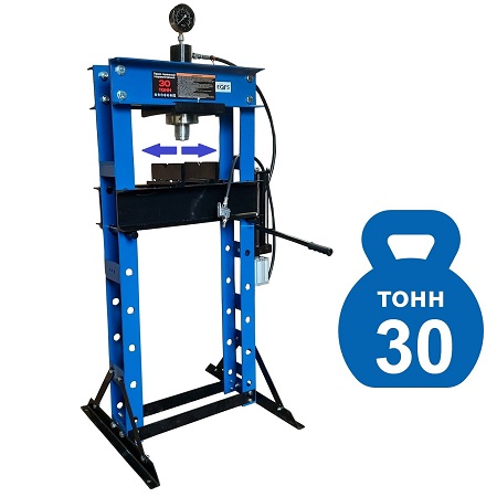 Полностью сварная рама, усилие 30 тонн, управление ручное/ножное, гидроцилиндр с пуансоном перемещается по всей ширине каретки, клапан защиты от перегрузки, манометр, ручная лебедка. Ход поршня 150 мм. Рабочее окно 540х1270 мм. Рекомендуется для выпрессовки подшипников, деталей машин, втулок и т.п. в автосервисе, Гараже и СТО. Доставка РФ, РБ, Армения, Казахстан, Киргизия.