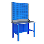 Бестумбовый. Допустимая нагрузка на столешницу 350 кг. Опорные элементы выполнены сварными из холоднокатаной стали. Для выполнения сборочных, ремонтных, слесарных, монтажных и других видов работ на производстве, в сервисных центрах, мастерских, гаражах, а также для обучения технологии в учебных заведениях. Комплектуется полкой-стенкой, расположенной под столешницей для удобного размещения габаритного инструмента и оснастки. Размеры верстака: 855x1196x696 мм. Вес: 38 кг. Поставляется в 4 комплектациях на выбор.