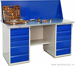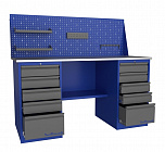 Верстак двухтумбовый поставляется в разобранном виде (4 элемента). Нагрузка на столешницу до 600 кг. Стандартный цвет: корпус - серый глянец RAL 7030, ящики и двери тумб - синий RAL 5017.  Размеры: 855x1600x700 мм. Масса: 83 кг.