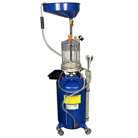 Емкость для слива и откачки масла с предкамерой для контроля количества поступающего масла, емкость бака 80л., с подъемной ванной емкостью 15 л., 6 заборных щупов (пневмопривод), производительность 1,5-2 л/мин , максимальная высота 1850 мм, давление слива масла 0,5 бар, вес 30кг.