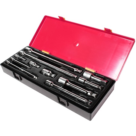 Набор удлинителей в прочном презентабельном боксе 8 предметов. В комплекте: удлинитель под ключ 1/2: 2, 3, 5, 10 - 4шт; переходник карданный 1/2 - 1 шт; вороток с шарниром 1/2, 15 - 1 шт; вороток с плавающей головкой 1/2, 12 - 1 шт и трещотка 1/2 - 1 шт.