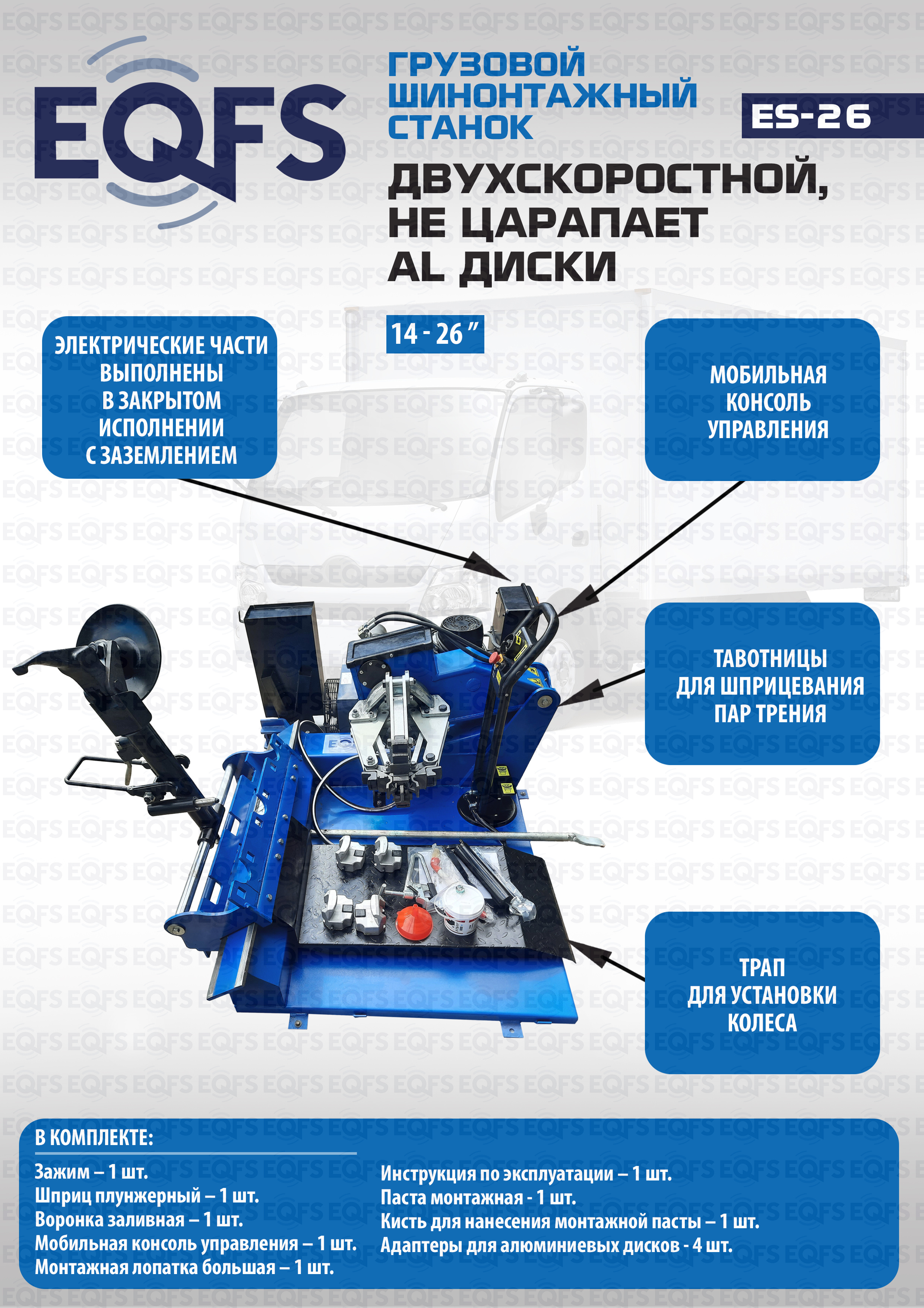 1. ES-26: гидравлический привод зажима колеса, усиленная рама, 2-х скоростной, дополнительные адаптеры для работы с алюминиевыми дисками.