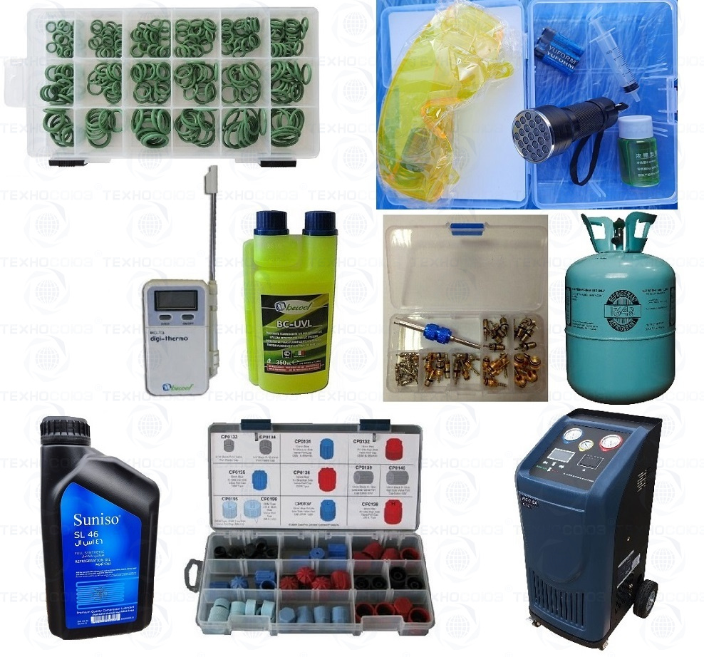 Комплект для заправки автомобильных кондиционеров состоит: автоматическая установка для заправки кондиционера, фреон, масло, течеискатель хладагента, набор золотников, ультрафиолетовая добавка, набор резиновых колец, набор колпачков и цифровой термометр