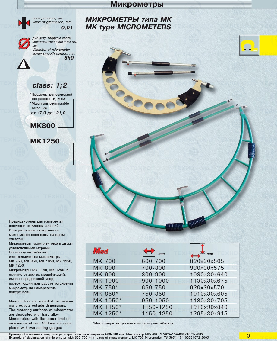 Цена деления 0,01 мм. Диапазон измерения от 900-1000 мм. Для измерения наружных размеров изделий. Измерительные поверхности микрометра оснащены твердым сплавом. Микрометры укомплектованы установочная мера 2 шт. Класса точности 1. ГОСТ 6507-90. Поставляется в двух вариантах с поверкой и без поверки!