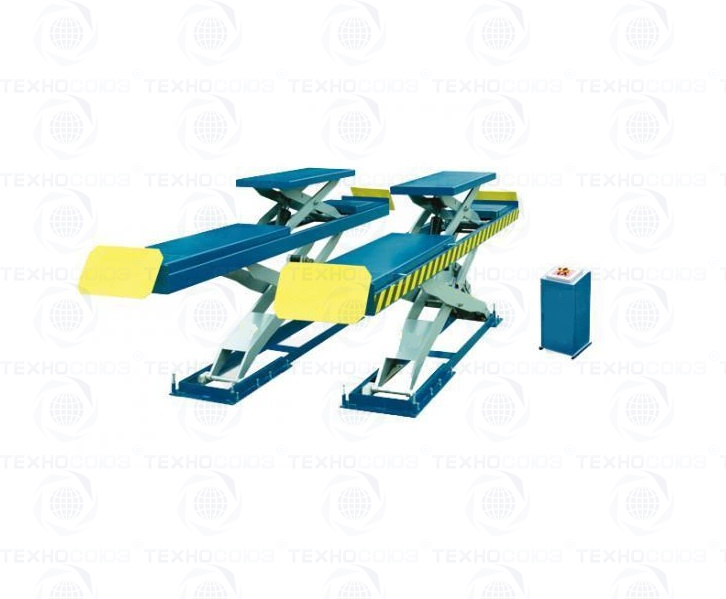 Двухуровневый ножничный подъемник оборудован пневматическим стопорным механизмом – требуется подключение к пневмолинии. Стойка управления подъемником расположена отдельно.