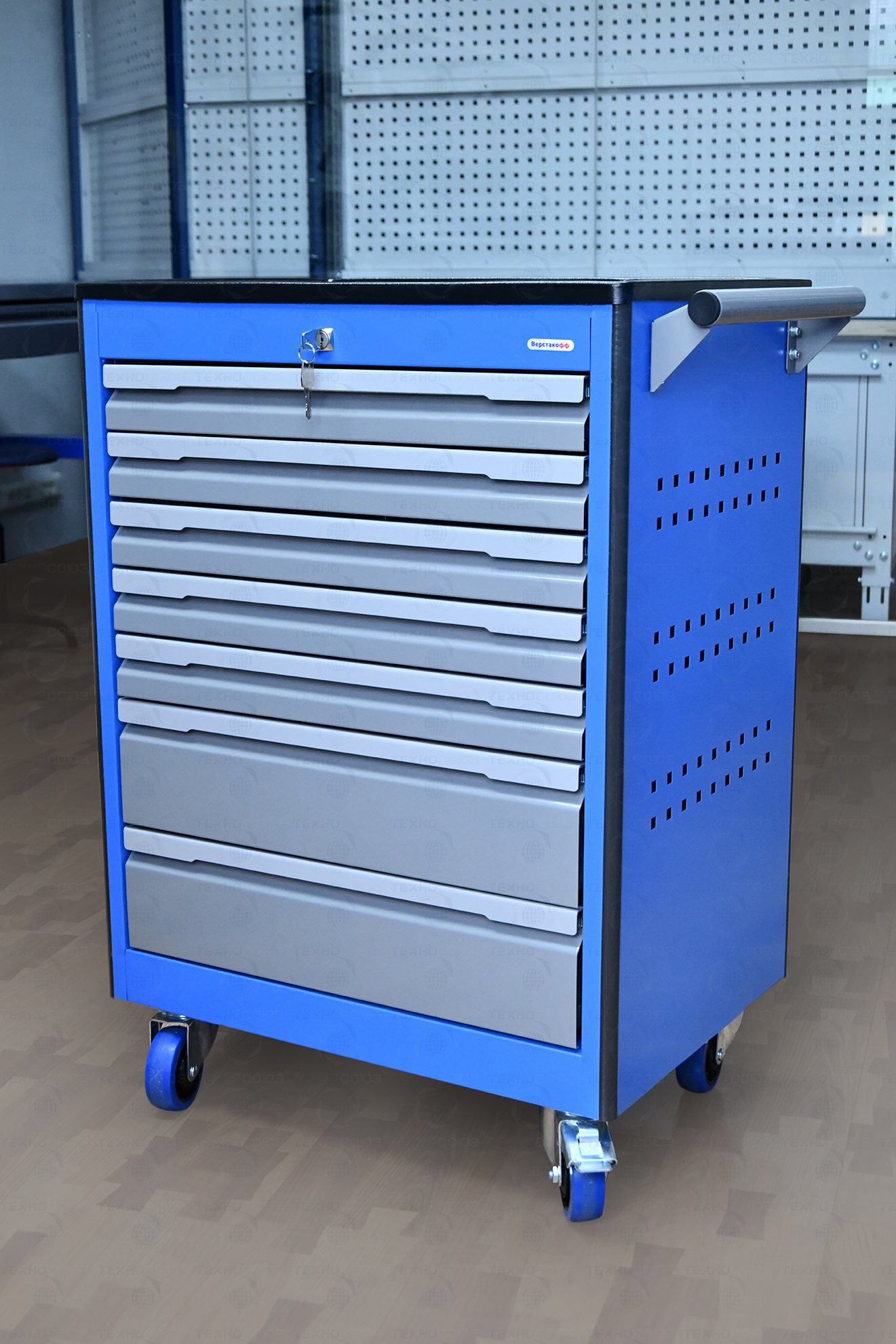 Тележка снабжена центральным замком с поворотом ригеля 180 градусов, который закрывает одновременно все ящики. Замок неподвижно и прочно закреплен на корпусе тележки. В комплекте имеется два ключа. Тяга замка подпружинена.