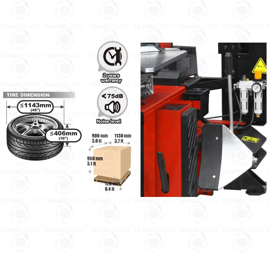 Шиномонтажный станок. Автомат. Размеры дисков: снаружи 12÷23", изнутри 14÷26". Мотор 1,1кВт. Электропитание 220/380В. Максимальный размер шины: Ø1143x406мм (45"x16"). 3-я рука (правая) в комплекте. Гарантия 18 мес – наш монтаж, 12 мес – самостоятельная установка.