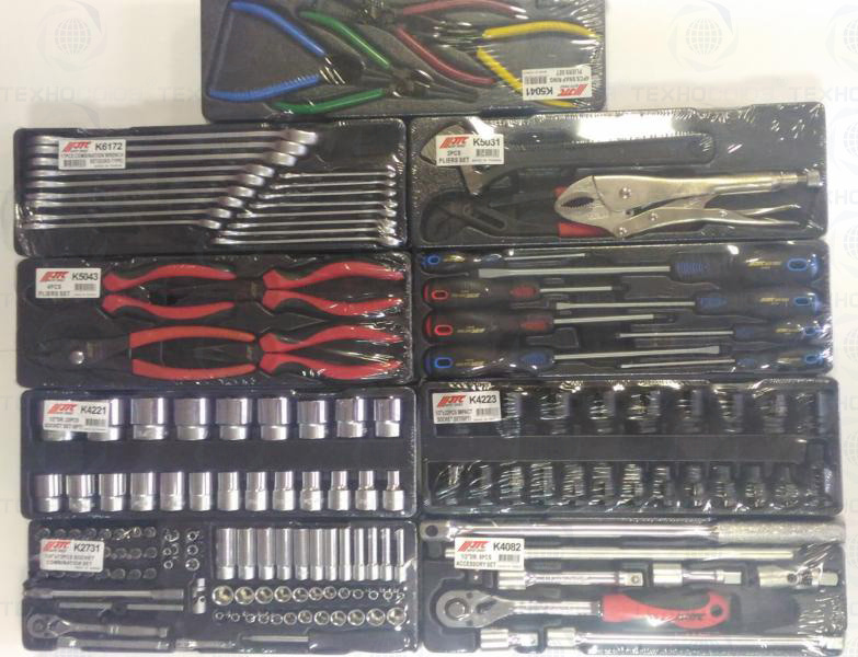 Данный набор инструмента включает: тележку инструментальную с 4 ящиками, комбинированные ключи, наборы головок и отверток, клещи, утконосы, щипцы и трещотку - это тот самый минимум, который понадобится при работе в гараже или СТО.