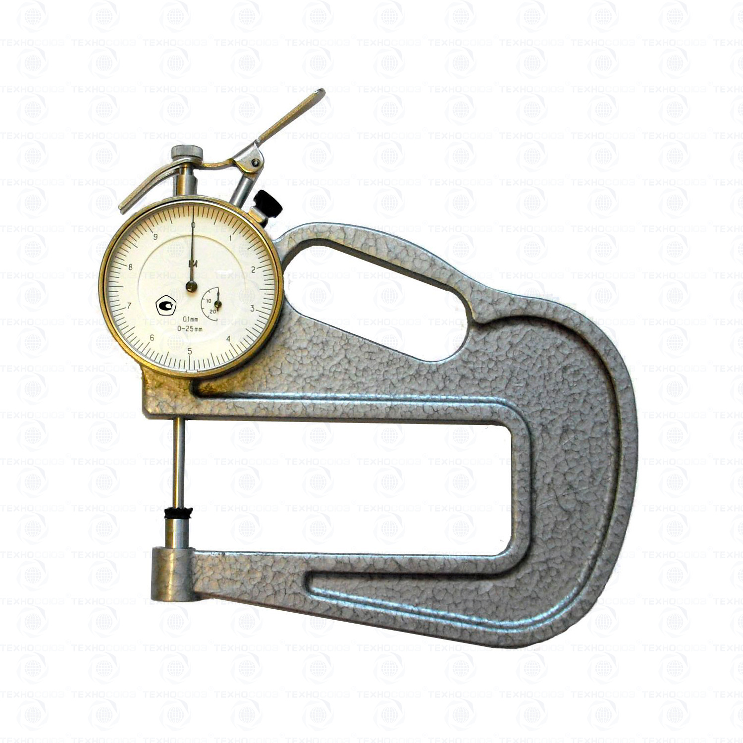 Толщиномер представляет собой скобу, в которой сверху расположено отсчетное устройство с измерительным наконечником , а снизу запрессована пятка. У толщиномера с нормированным измерительным усилием для установки измерительного стержня отсчетного устройства в рабочее положение имеется арретир (отводка).