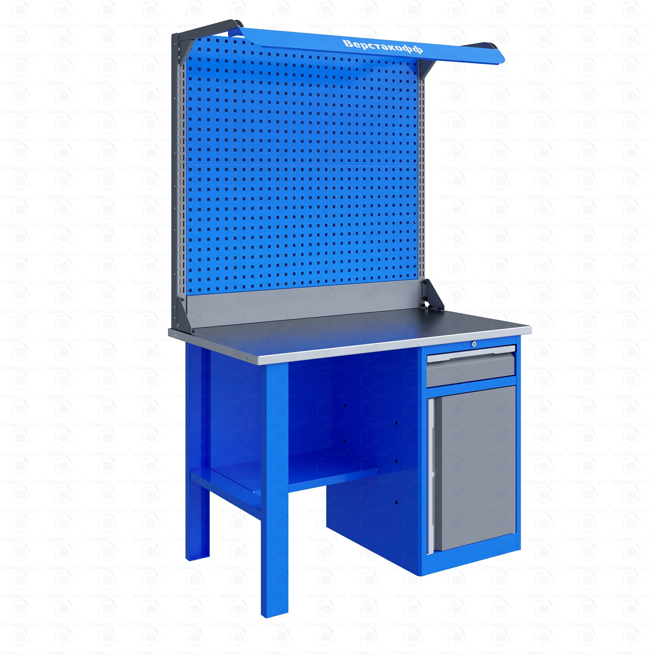 Однотумбовый. Допустимая нагрузка на столешницу 750 кг. Опорные элементы выполнены сварными из холоднокатаной стали. Верстак состоит из столешницы, опоры, тумбы P8 с малым ящиком и отделением с дверью и одной полкой, полки-стенки, двойного экрана с кронштейнами и комплекта освещения. Все металлические элементы покрыты полиэфирной порошковой краской. Столешница состоит из фанеры марки ФСФ толщиной 24 мм, которая покрыта лаком-антисептиком и листом оцинкованной холоднокатаной стали толщиной 1,2 мм. Размеры (ВхШхГ) 1965x1196x696 мм.